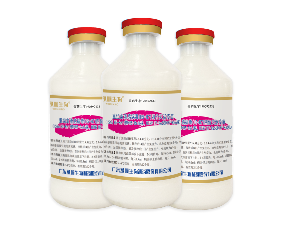 本品系用重组禽流感病毒H5N6亚型H5-Re15株、H5-Re16株和H7N9亚型H7-Re5株、H7-Re6株分别接种易感鸡胚培养,收获感染鸡胚液,经浓缩、甲醛溶液灭活后,加矿物油佐剂混合乳化制成。用于预防由H5亚型2.3.4.4h分支、2.3.4.4b分支和H7亚型A分支、B分支禽流感病毒引起的禽流感。
